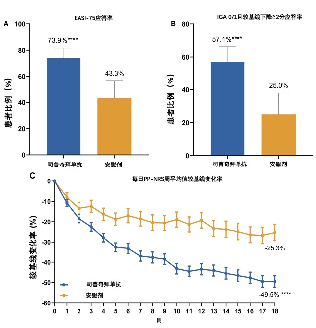 圖2:司普奇拜單抗治療18周患者改善:(A) EASI-75應答率;(B) IGA 0/1且較基線下降≥2分應答率;(C) 每日PP-NRS周平均值較基線變化率(****:P < 0.0001 vs. 安慰劑)