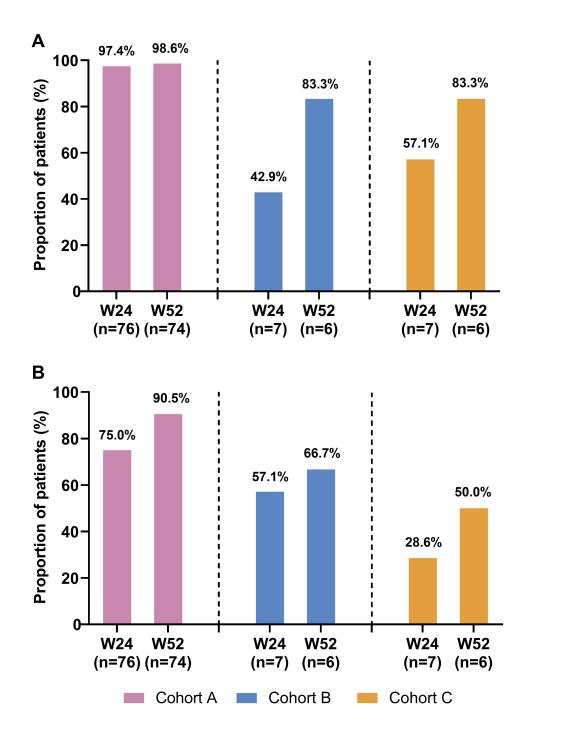 結果顯示,A組患者在第24周和第52周分別有97.4%與98.6%維持NPS應答;B組24周NPS與鼻塞評分(NCS)應答率分別升高至42.9%與57.1%,而52周NPS與NCS應答率分別升高至83.3%與66.7%;C組24周NPS與NCS應答率分別升高至57.1%與28.6%,而52周NPS與NCS應答率分別升高至83.3%與50.0%(圖4)。