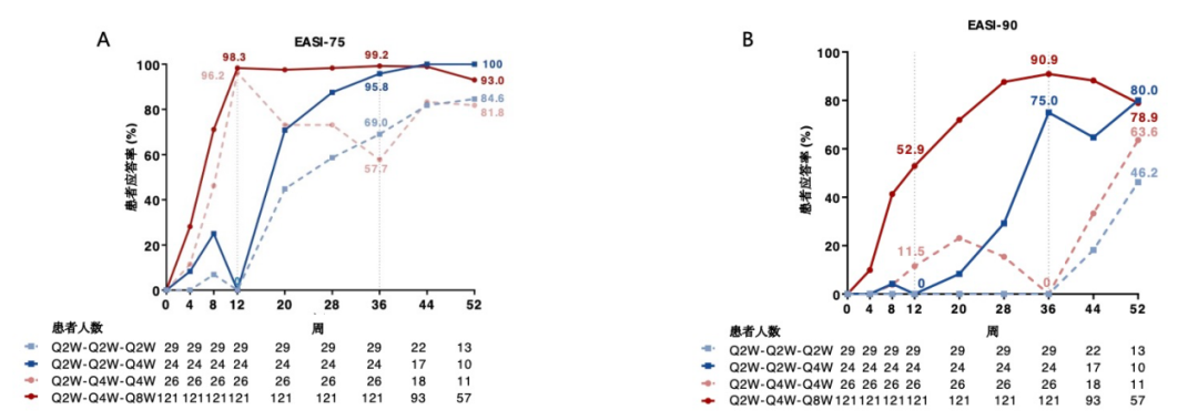 本研究尚在進行中,截至2025年4月7日,共256例患者完成12周治療,200例完成36周治療,其中85.5%的患者成功實現給藥間隔延長*。共91例患者完成52周治療,各治療組均表現出顯著且持續的皮損改善: