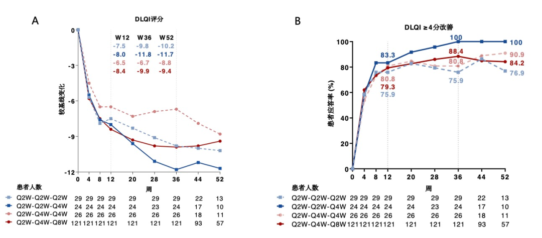 圖5:司普奇拜單抗持續治療至52周,(A) 各組DLQI評分較基線變化;(B) 各組DLQI評分較基線改善≥4分的應答率